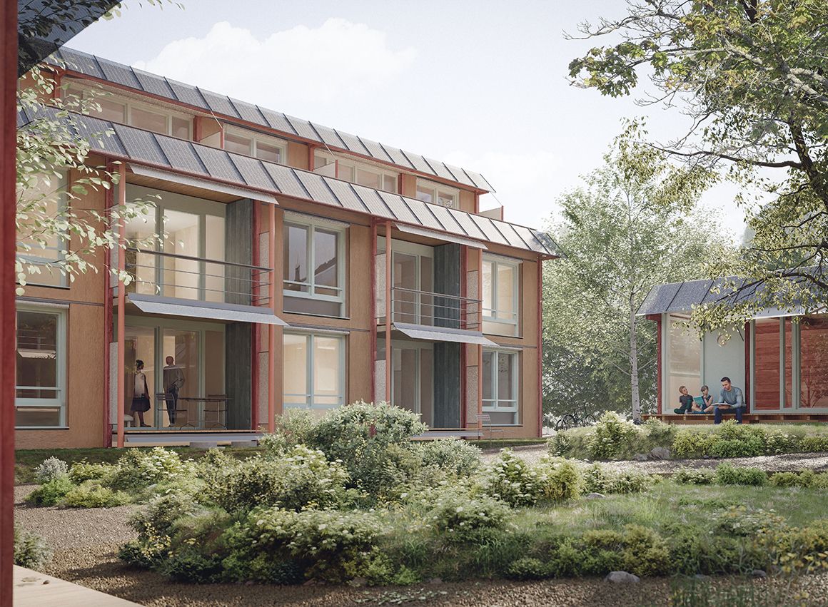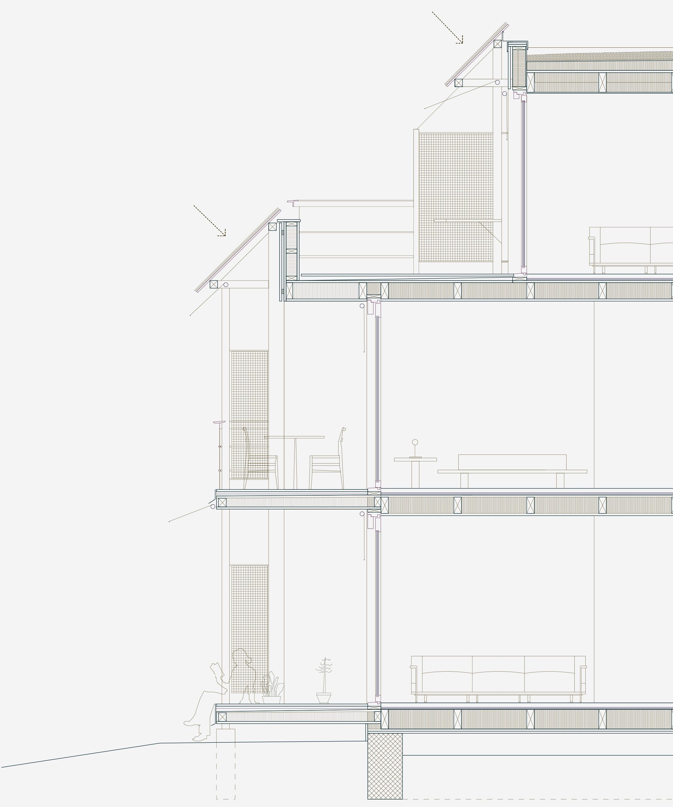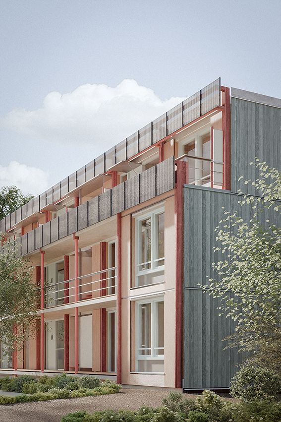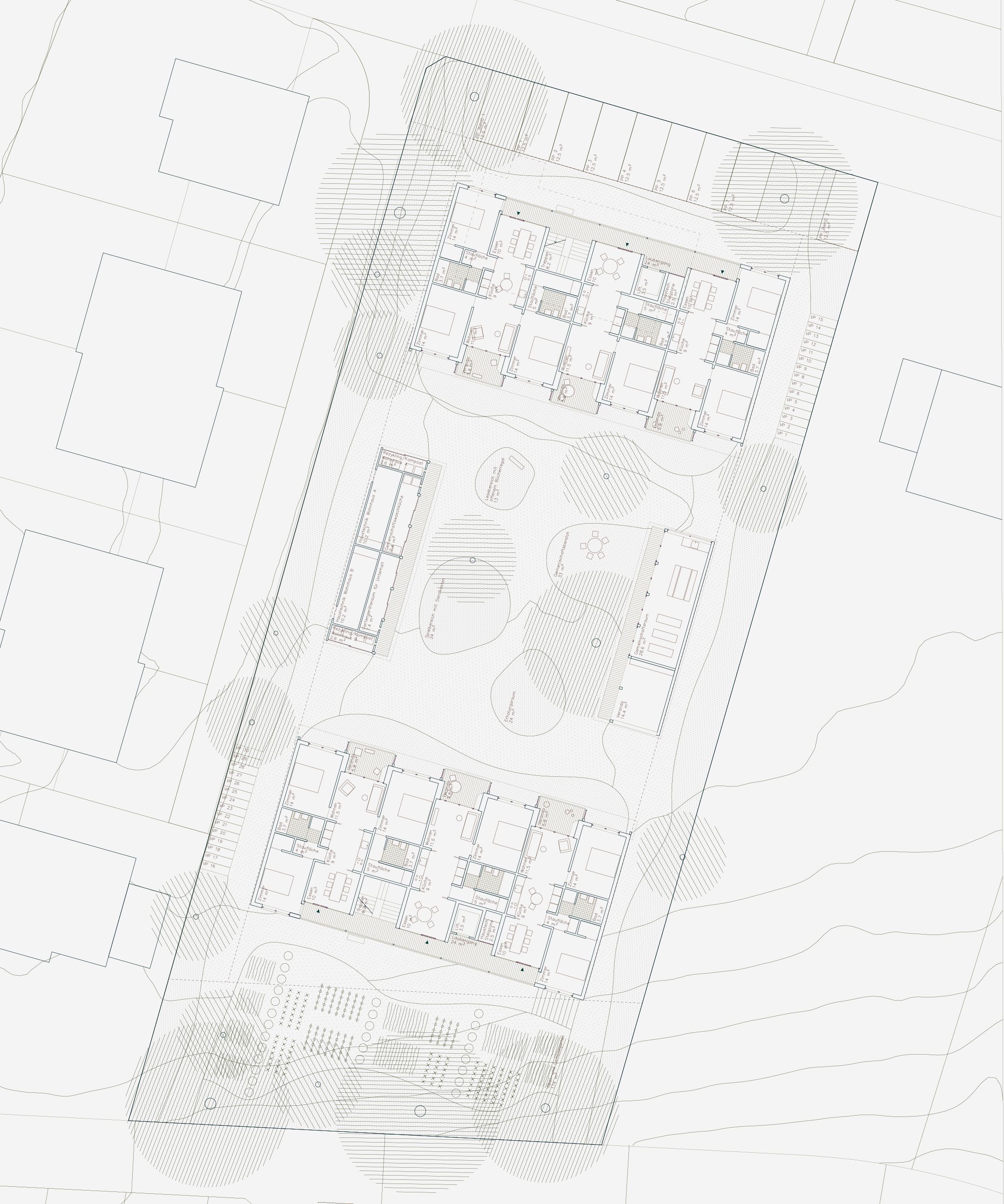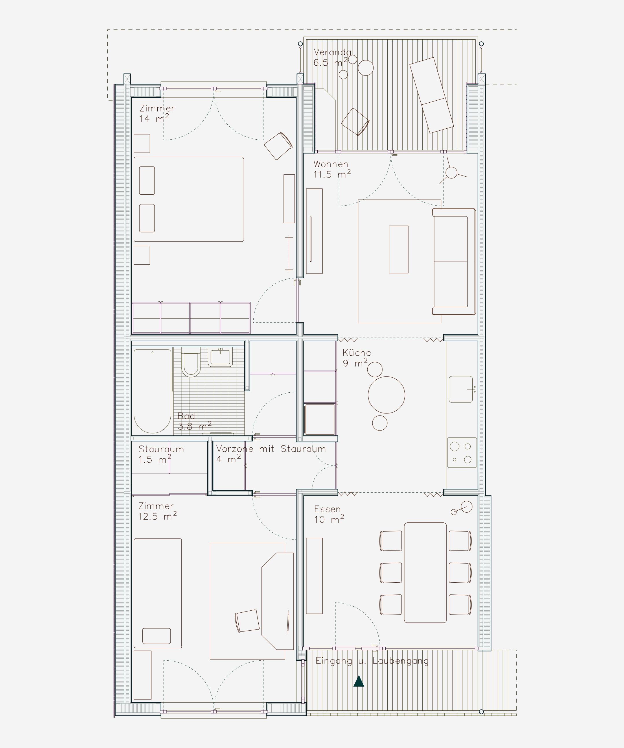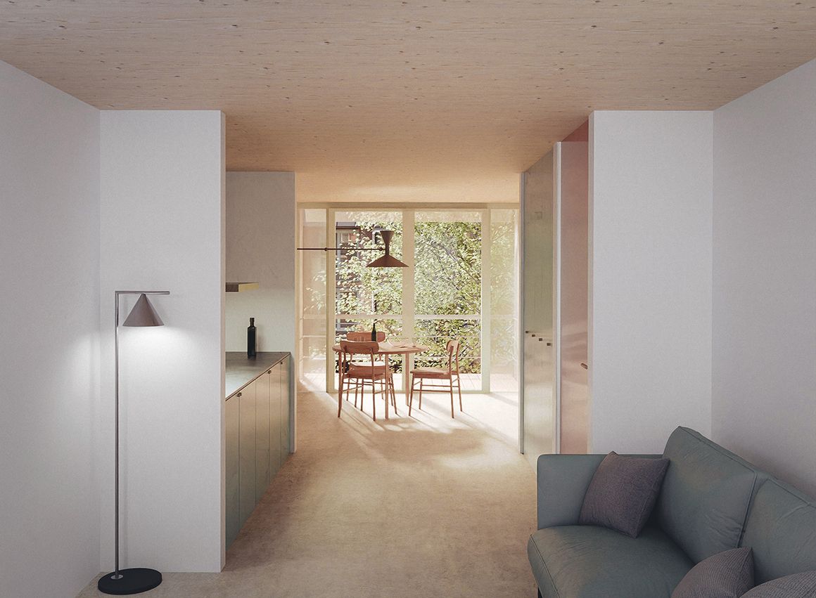 Zwei Wohnbauten und zwei Pavillons bilden ein einfaches Ensemble, das den gemeinschaftlich genutzten Garten in der Mitte freilässt. Die Häuser stehen am Rand der Parzelle und schaffen eine klare städtebauliche Figur, offen zur Nachbarschaft und doch eindeutig gefasst. Der Garten wird zur räumlichen und sozialen Mitte des Projekts – Ort für Alltag, Rückzug und gemeinschaftliche Nutzung. Das Wohnen entfaltet sich in einer Folge von Innen- und Aussenräumen. Laubengänge, Veranden und Übergangszonen werden zu sozialen Räumen, die beiläufige Begegnung ermöglichen, ohne Privatheit aufzuheben. Unterschiedliche Wohnungstypen erlauben generationenübergreifendes Wohnen: kompakte Einheiten, Familienwohnungen, Stöckli-Modelle. Die Grundrisse sind robust, gut belichtet und flexibel nutzbar – anpassbar an veränderte Lebensformen. Die Architektur folgt einer elementaren Ordnung: ein modularer Holzbau, der durch Wiederholung Qualität erzeugt und aus einfachen Bauteilen räumliche Vielfalt schafft. Zwei Pavillons ergänzen das Ensemble – einer für gemeinschaftliche Nutzungen, einer für Technik und Lager – und machen ein Untergeschoss überflüssig. So werden Materialverbrauch, Eingriffe in den Boden und Leitungswege reduziert. Passive Klimastrategien, Fernwärme und integrierte Solarpanels sichern einen ressourcenschonenden Betrieb.
